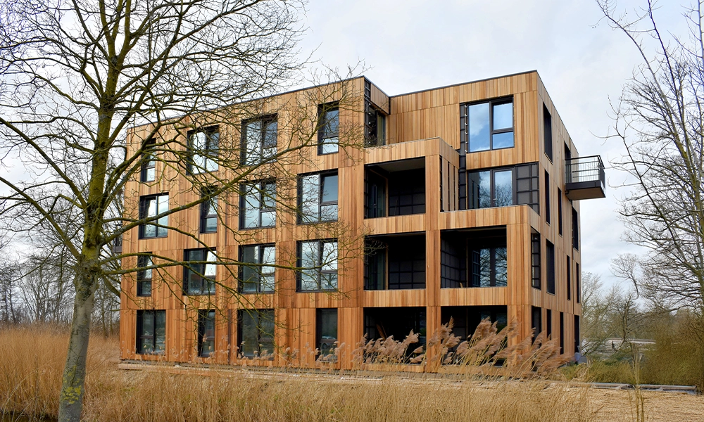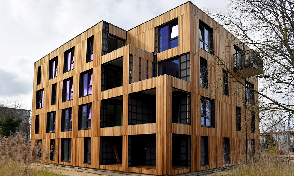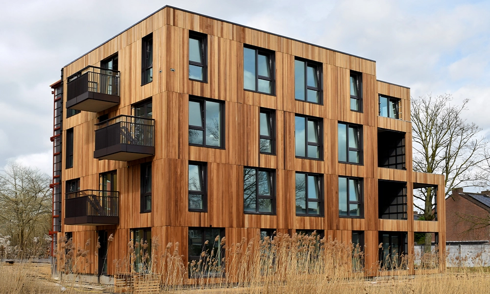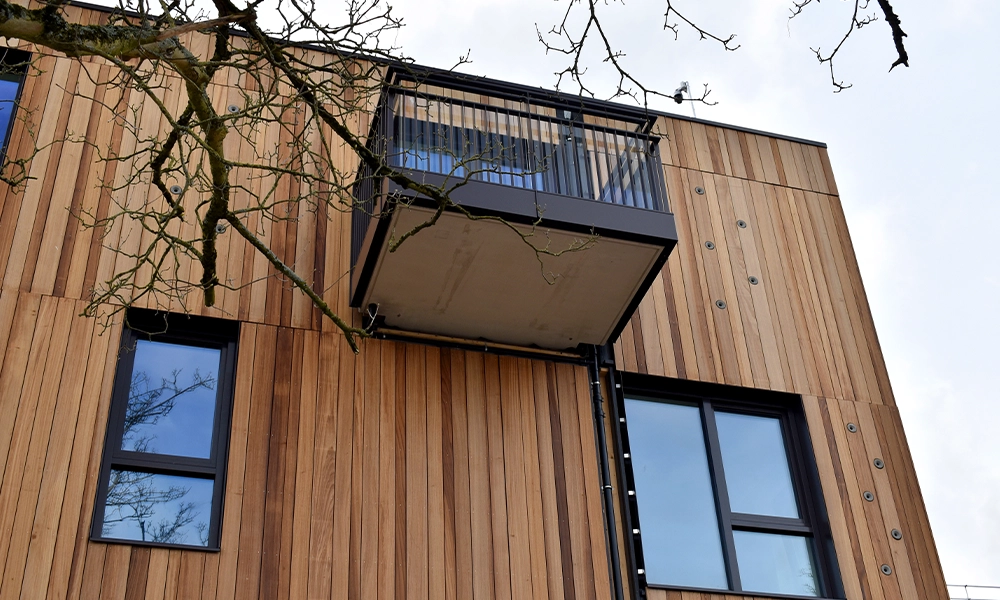 De combinatie van het hout en de structuur van het profiel geeft het gebouw een krachtige en rustige uitstraling. De afwerking sluit goed aan bij de architectuur van het gebouw en zorgt voor een natuurlijke, warme gevel. Met de toepassing van Obèche Noir ontstaat zo een duurzame houten gevel met oog op de toekomst.