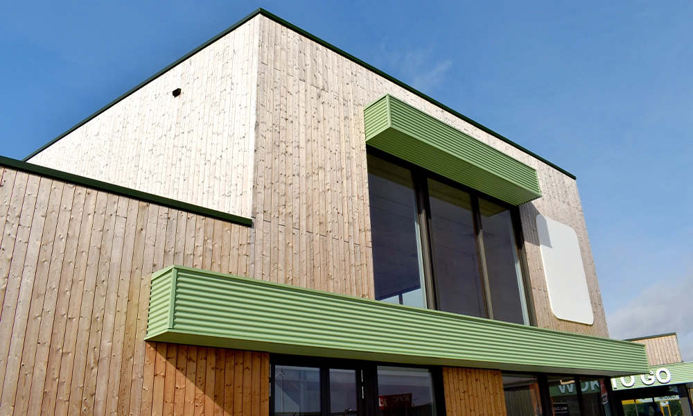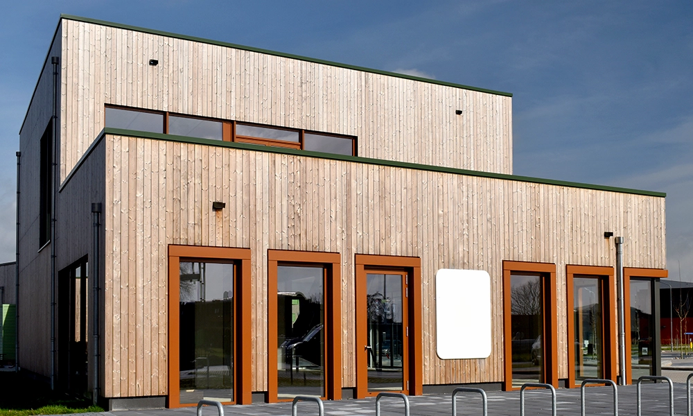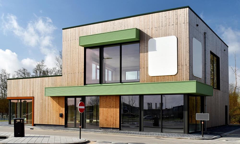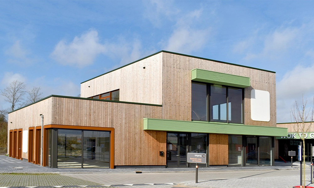 Deze houtsoort geeft de gebouwen een natuurlijke, robuuste en warme uitstraling die perfect past bij de eigentijdse architectuur van het park. Door het hout onbehandeld toe te passen, zal het op een natuurlijke manier vergrijzen. Hierdoor ontstaat in de loop der tijd een rustig en karaktervol beeld dat blijft aansluiten bij de omgeving.
