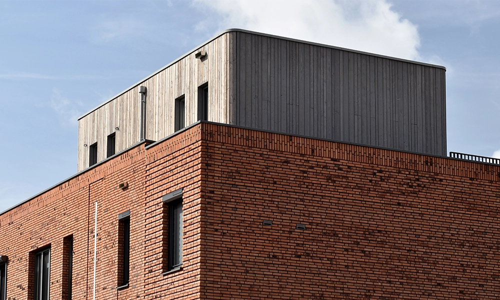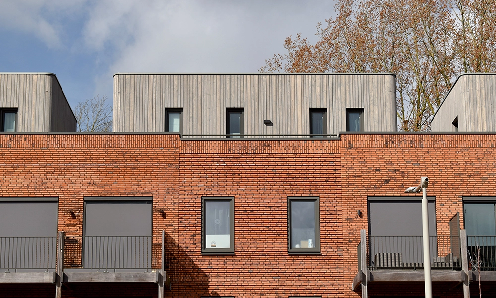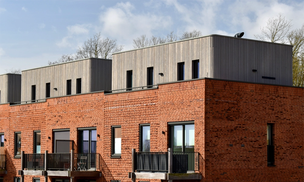 Bij een groot aantal van deze woningen is gekozen voor Vuré Noir gevelbekleding. Deze gevelbekleding is toegepast in de bovenste delen van de woningen en geeft het project een krachtige, moderne uitstraling met een natuurlijke houtstructuur.